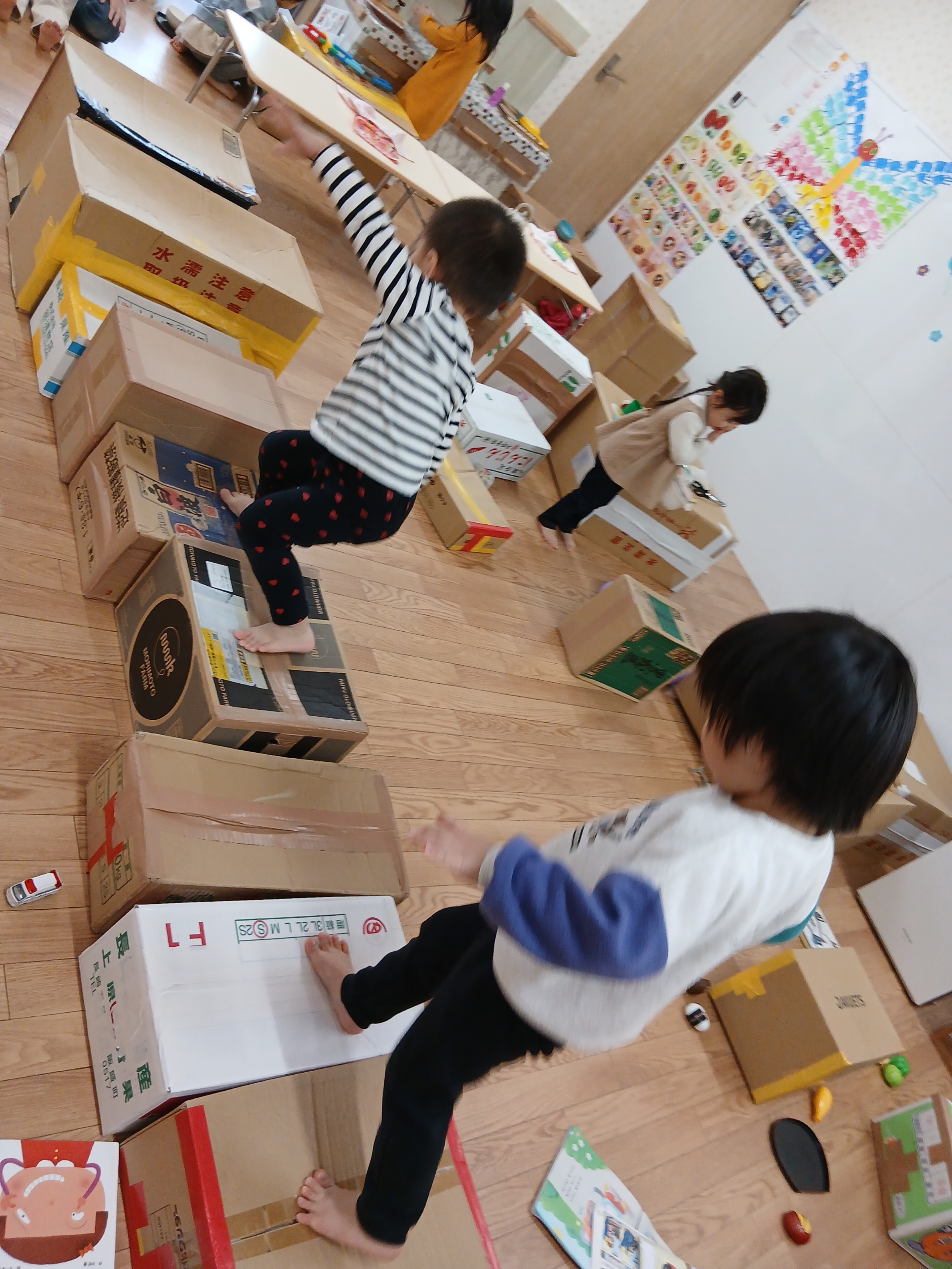 ダンボールの上にのって歩いたり