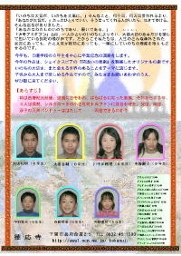 | 三寒四温、とさすがに早春の気配です。 このたび、日曜学校卒業記念劇『二人のバンドゥー』の上演にあたりましては、ご縁のある皆様の心あたたかいご協力や、お励ましを頂き、厚くお礼申し上げます。 劇中、シルクロードのオアシス都市トルファンで、一家が再会できたのは、本当に偶然だったのですがこの偶然は、目に見えない必然に支えられていたのです。二十年にわたる別離を支えていたもの それは、生まれたときから注がれてきた、あふれんばかりの肉親の温もりであり、父母にとっては、阿弥陀さまへの信頼と帰依の思いではなかったでしょうか。 「シルクロード(絹の道)」は、「アミダ・ロード(阿弥陀の来た道)」ともよばれます。二千五百年の歴史を経て、大きな願いの世界が私の所に到り届いた、ただひとつの白い道ではないでしょうか。それは、遙かなる弥陀の浄土から私たちに向かって開かれた、大いなる願いのかよいあう光の道なのです。 今年も大勢のスタッフや、皆さんに支えられ、劇を発表することができ、四人の六年生が、すばらしい思い出と共に日曜学校を巣立っていきました。たくさんの方々のお手伝い、差入れ、そして当日は小さな子供たちから、おじいさん、おばあさんまで、多くの人に観ていただきありがとうございました。 ご本堂でいっしょに食事をいただいたり、劇の練習の語らいの中で「いのち」ある、生きとし生けるすべてのものをあたたかく、やさしく包み込んでくださる「阿弥陀様の光」をうれしく、ありがたく、おもわせていただいたひとときでした。 長い人生の中には、辛いことも、悲しいこともたくさんあるでしょう。けれども、阿弥陀さまの光(いのち)の中で、これからの人生も生きぬいていってほしいと願っています。 爛漫の春ももうじきです。 新しい世界へと旅立っていく六年生に、両手一杯の拍手をおくりたいと思います。 称 名 平成十八年 三月 徳応寺日曜学校 戸 崎 文 昭 有縁の皆様へ |