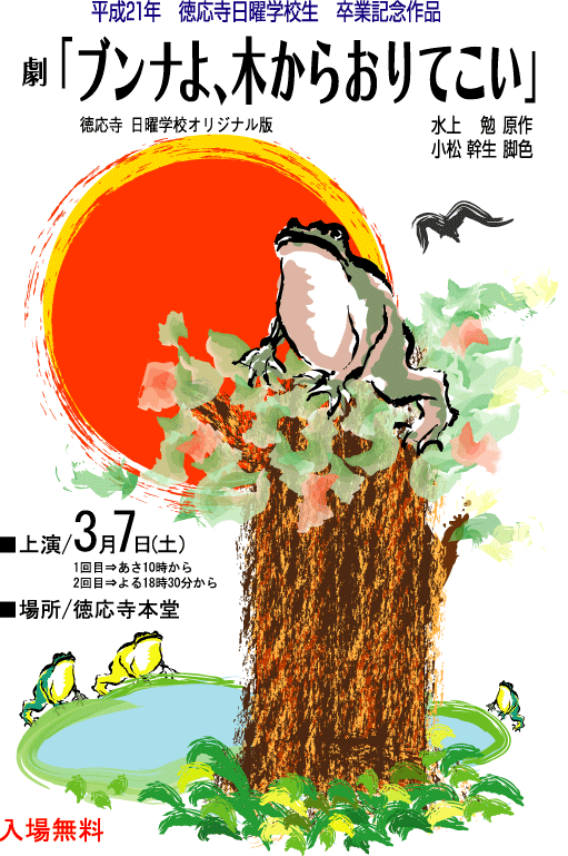 『ブンナよ、 木からおりてこい』 平成21年卒業記念劇 日時:平成21年3月7日(土) 午前10時〜 (1回目) 午後6時半〜(2回目) 場所:徳応寺本堂 |