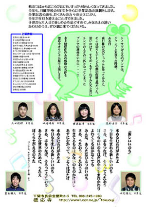 | 桜のつぼみもほころび始め、街の中も春の光がいっぱいに満ちてまいりました。 このたび、日曜学校卒業記念劇『ブンナよ、木からおりてこい』の上演にあたりましては、ご縁のある皆様方の心あたたまるご協力や、お励ましを頂き、厚くお礼申し 上げます。 冒頭のお坊さまのセリフに「うばい合いをしちゃダメだよ、仲良くしなくちゃいけないよ。強い者が食べ物を一人じめにして、弱い者を見殺しにするのは悪いことだ。強い者は、弱い者をいつもかばってやらなくてはいけない。」という言葉がありました。私たち自身、言われ続けた言葉です。けれども、我が身に危険がせまっている状況にあって、私たちは、この言葉どおりの行いができるのでしょうか。 本当は心寂しかった百舌、最後の最後まで、どうにかして生きたいと願ったすずめ。極限状態での行為をいやというほど思い知らされたねずみ。そして、その一部始終を見聞きし 生きのびたカエルのブンナ。春 五月、地上におりたブンナの目にあちこちでうまれ育っている新しいいのちは、どんなにまぶしく、うつくしく見えたことでしょう。 一つ一つの輝いているいのち、そのいのちは、実はたくさんのいのちがつながりあって、今ここにあります。 今年も四人の六年生が、日曜学校を卒業しました。新しい世界へ向かって強く羽ばたいていってほしいと願っています。大人も子どもも、すべての生きとし生けるものが、阿弥陀さまの光(いのち)の中で、手をとりあって生きていけることを願って、今後も日校活動を続けてまいります。どうかあたたかく見守って下さいますようお願いしてお礼のことばといたします。 有縁の皆様へ 称 名 平成21年3月 徳応寺日曜学校 戸崎文昭 |