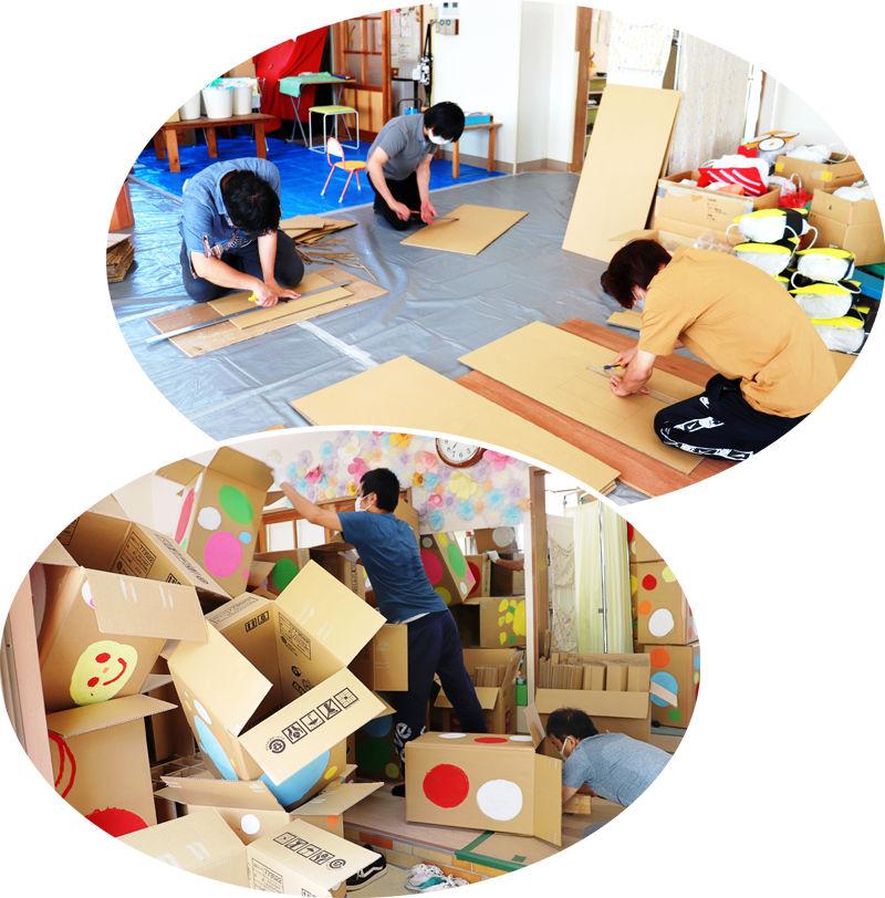 段ボール箱を補強するための中の骨組みも、お父さん達が段ボールで作り安全性と強度を高め、大人が乗ってもびくともしません。