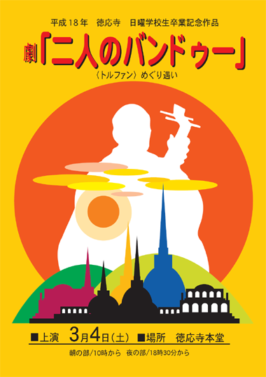平成18年卒業記念劇 『二人のバンドゥー』 日時:平成18年3月4日(土) 午前10時〜 (1回目) 午後6時半〜(2回目) 場所:徳応寺本堂 |